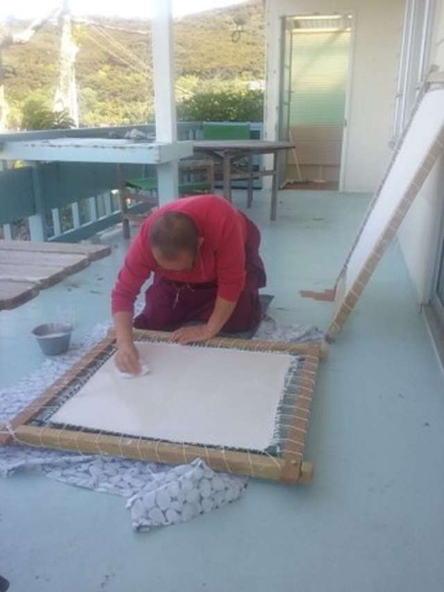Ellen’s Teacher, Nyima Gyaltsen, preparing the canvas